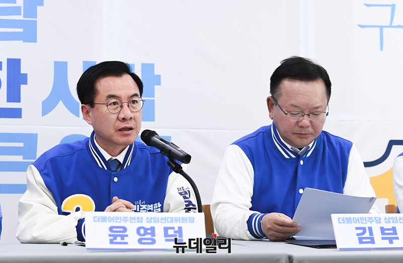 운영덕 더불어민주연합 상임선대위원장이 2일 오후 경북 구미시 김현권 구미을 후보 선거사무소에서 열린 '더불어민주연합·더불어민주당 경북도당 합동 비전 정책 공동선언식'에서 인사말을 하고 있다. (경북 구미=서성진 기자)