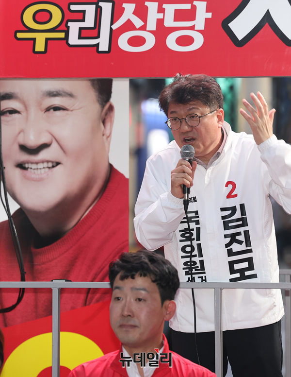 김진모 국민의힘 충북 청주서원구 후보가 2일 오후 충북 청주시 성안길에서 열린 '국민의힘으로 청주살리기' 집중유세장에서 지지호소를 하고 있다. (충북 청주=정상윤 기자)