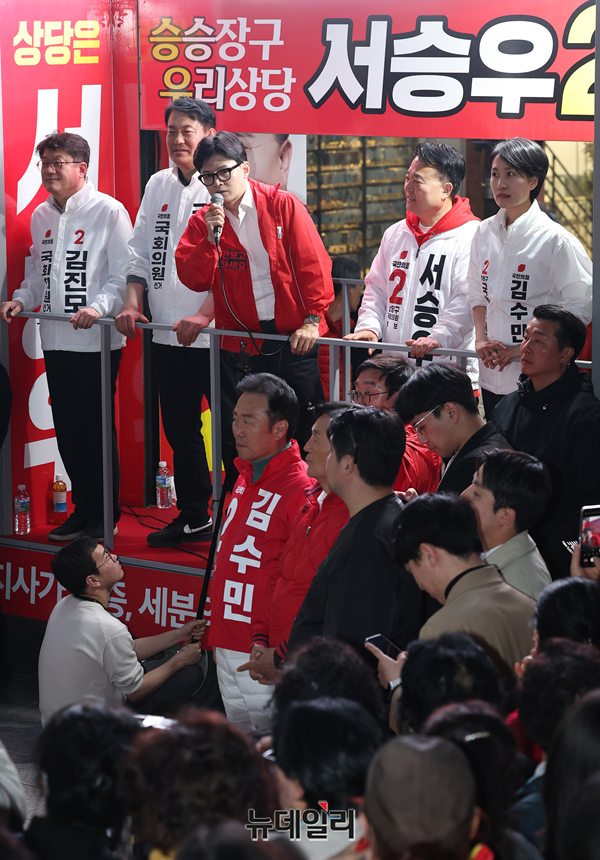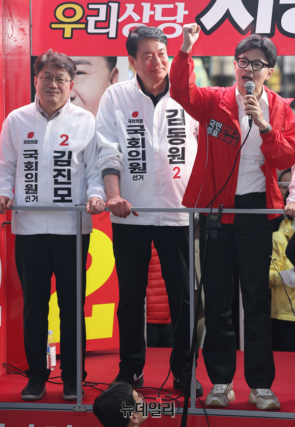 한동훈 국민의힘 총괄선대위원장이 2일 오후 충북 청주시 성안길에서 열린 '국민의힘으로 청주살리기' 집중유세에서 김진모, 김동원, 김수민, 서승우 후보들과 차량에 올라 지지호소를 하고 있다. (충북 청주=정상윤 기자)