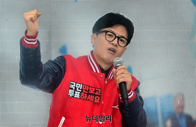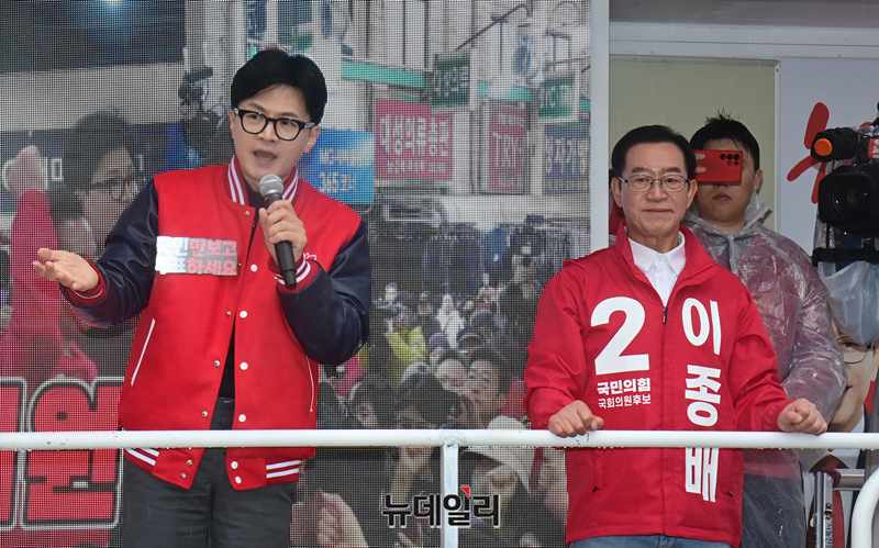 한동훈국민의힘 비대위원장이 3일 오전 충북 충주 성서 차없는거리에서 열린 '국민의힘으로 충주살리기' 지원유세에서 이종배 충주시 후보의 지지를 호소하고 있다. (충북 충주=이종현 기자)