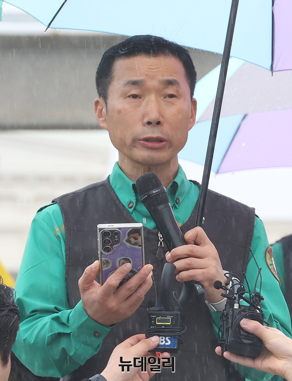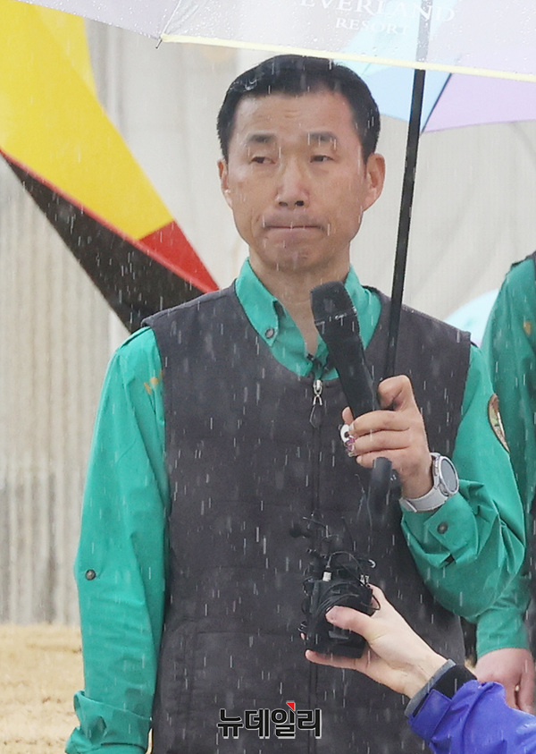 자이언트 판다 푸바오가 중국으로 떠나는 3일 오전 경기 용인시 에버랜드에서 강철원 사육사가 인사말을 하고 있다. (사진=공동취재단)