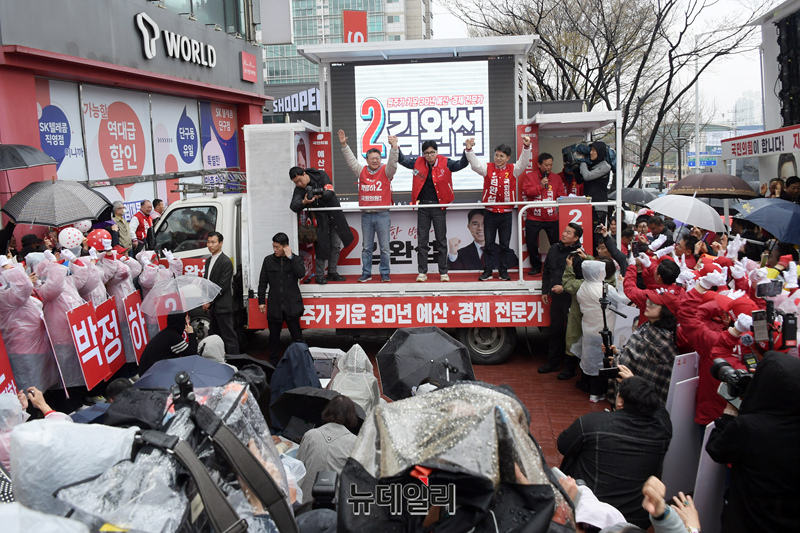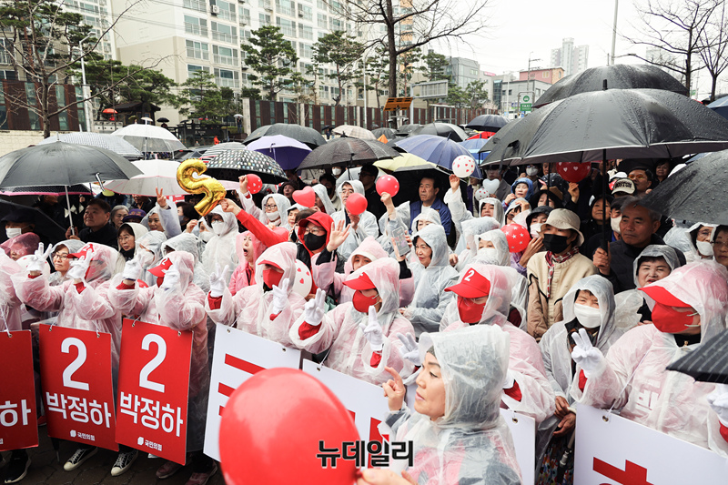 한동훈 국민의힘 비상대책위원장 겸 총괄 선거대책위원장이 3일 오전 강원 원주시 롯데시네마 앞에서 박정하 강원 원주시갑 후보, 김완섭 강원 원주시을 후보의 지지를 호소하고 있는 가운데 시민들이 발언을 듣고 있다. (사진=공동취재단)