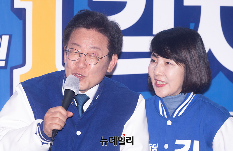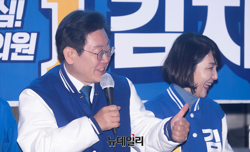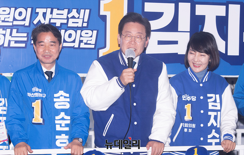 이재명 더불어민주당 상임선대위원장이 3일 오후 경남 창원시 도계부부시장에서 열린 선거유세 현장에서 김지수 창원의창 후보, 송순호 창원마산회원 후부와 함께 지지를 호소하고 있다. (경남 창원=서성진 기자)