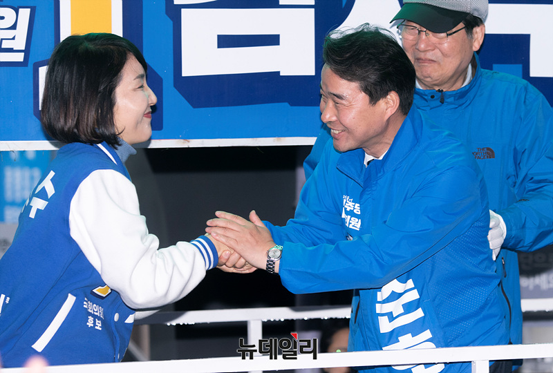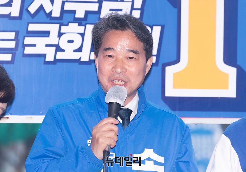 송순호 더불어민주당 창원마산회원 후보가 3일 오후 경남 창원시 도계부부시장에서 열린 김지수 창원의창 후보 선거유세 현장에서 지지를 호소하고 있다. (경남 창원=서성진 기자)