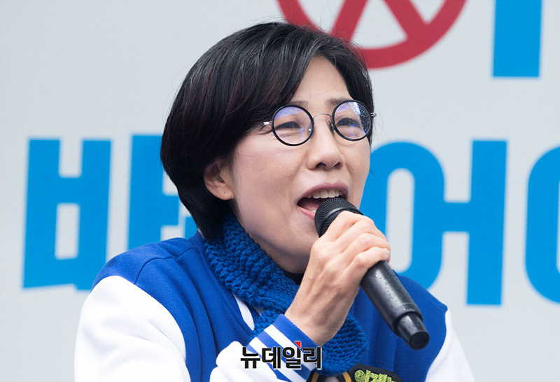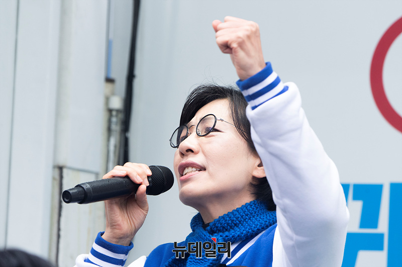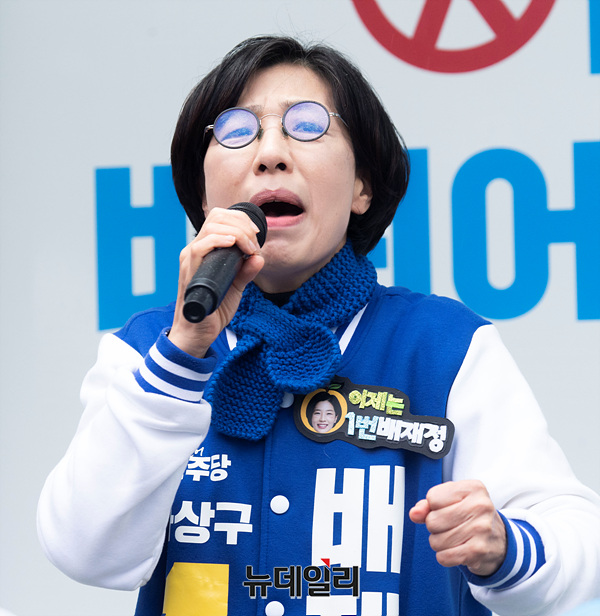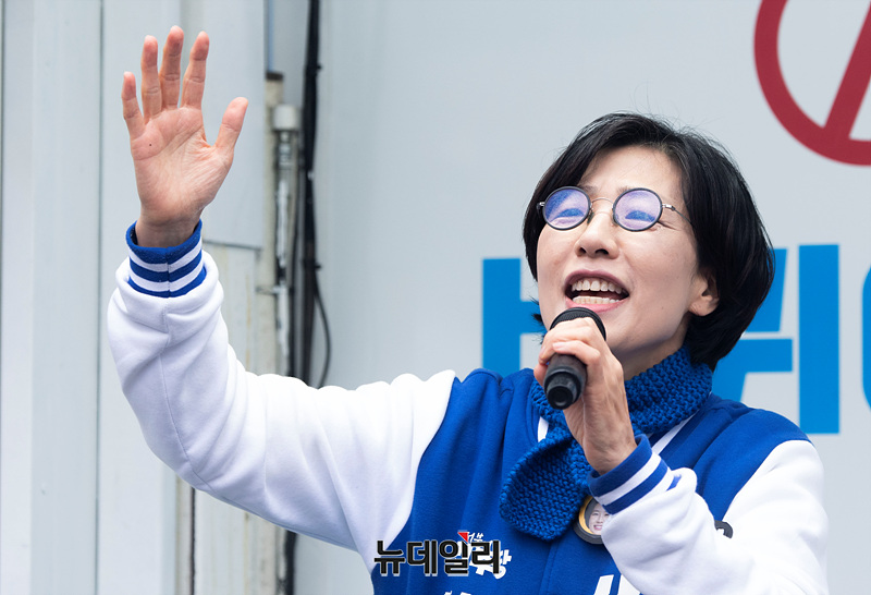 배재정 부산사상 후보가 3일 오후 부산 롯데하이마트 사상점 앞에서 열린 선거유세 현장에서 지지를 호소하고 있다. (부산=서성진 기자)