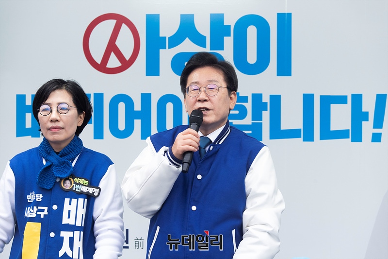 이재명 더불어민주당 상임선대위원장이 3일 오후 부산 롯데하이마트 사상점 앞에서 열린 배재정 부산사상 후보 선거유세 현장에서 지지를 호소하고 있다. (부산=서성진 기자)