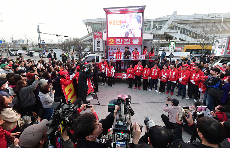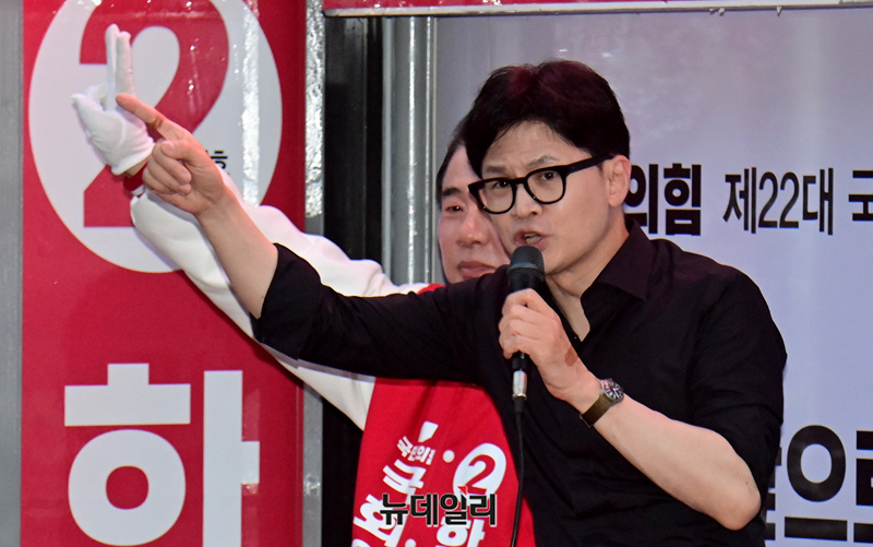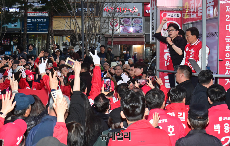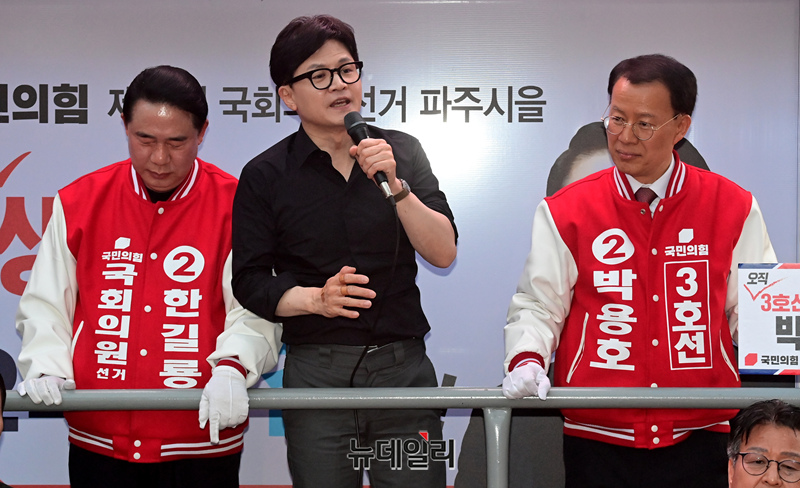 한동훈 국민의힘 비상대책위원장 겸 총괄 선거대책위원장이 3일 경기 파주 금릉역 앞에서 열린 박용호 파주갑 후보, 한길룡 파주을 후보, 지원유세에서 지지를 호소하고 있다. (경기 파주=이종현 기자)
