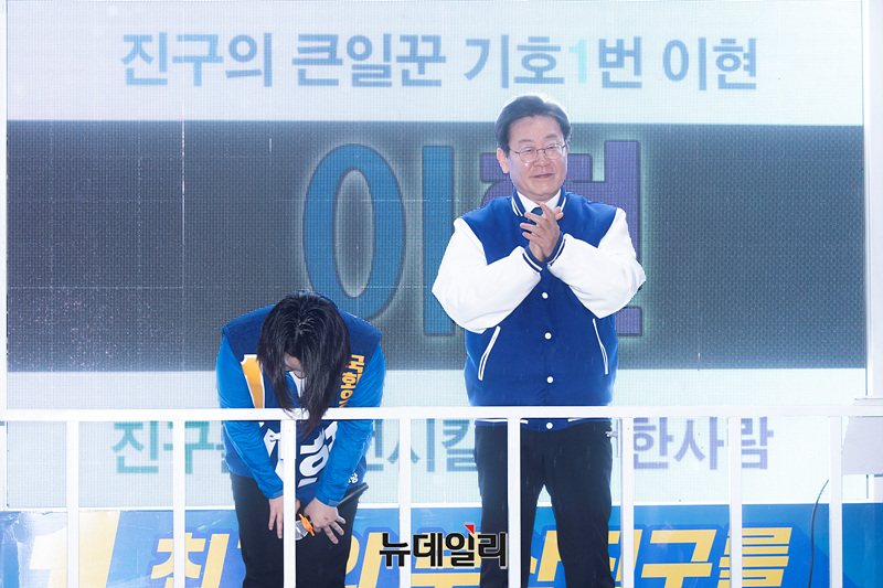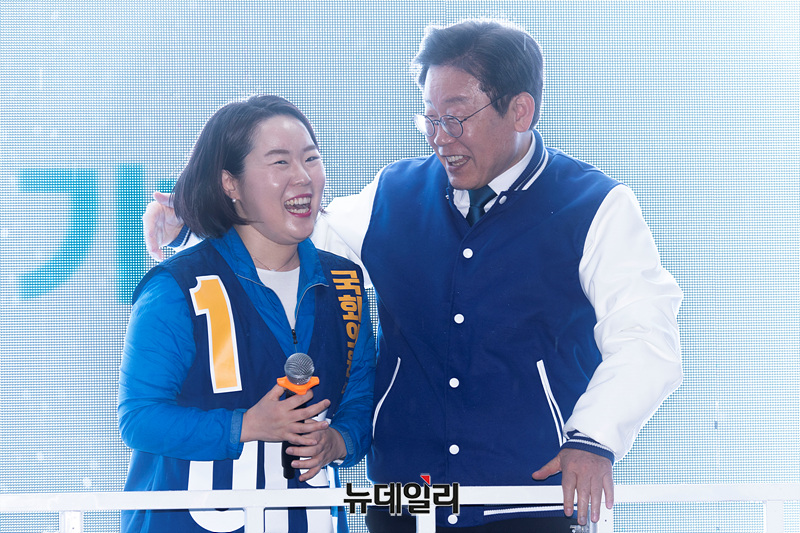 이재명 더불어민주당 상임선대위원장이 3일 오후 부산 개금역 앞에서 열린 선거유세 현장에서 이현 부산진을 후보와 인사하고 있다. (부산=서성진 기자)