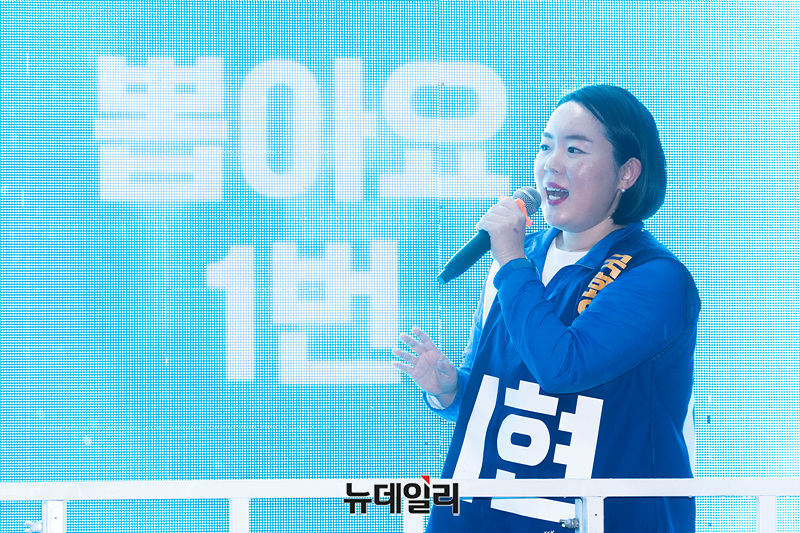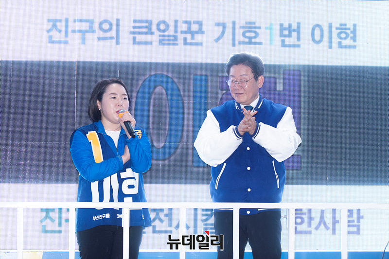 이현 더불어민주당 부산진을 후보가 3일 오후 부산 개금역 앞에서 열린 선거유세 현장에서 지지를 호소하고 있다. (부산=서성진 기자)