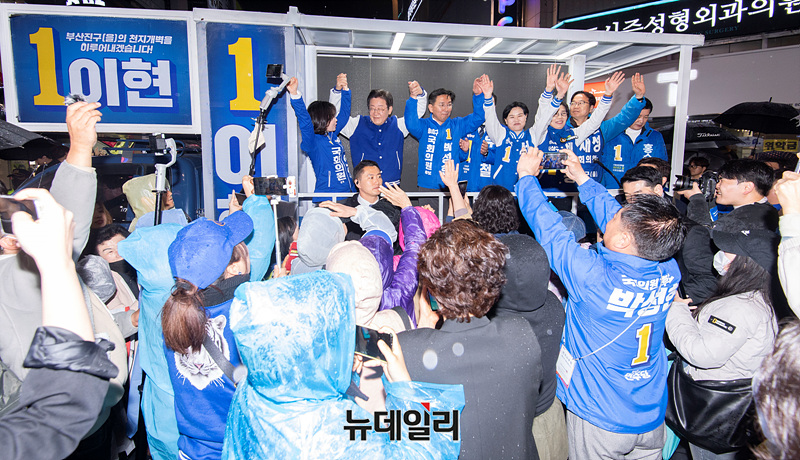 이재명 더불어민주당 상임선대위원장과 부산지역 후보들이 3일 오후 부산 서면 젊음의거리 인근에서 열린 더불어민주당 집중유세에서 시민들에게 인사하고 있다. (부산=서성진 기자)