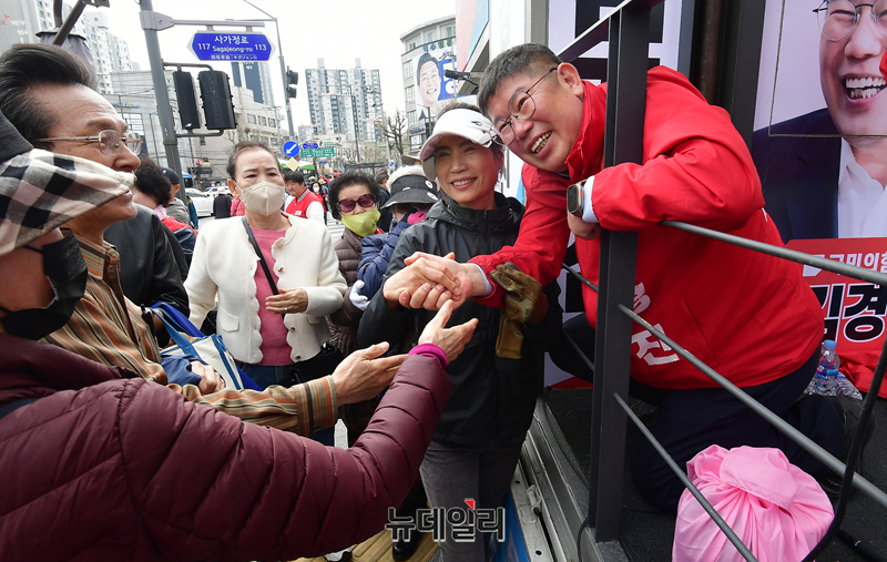 김경진 국민의힘 동대문을 후보 4일 오전 서울 동대문구 전농동사거리에서 열린 집중유세에서 지지자들과 악수를 나누고 있다.