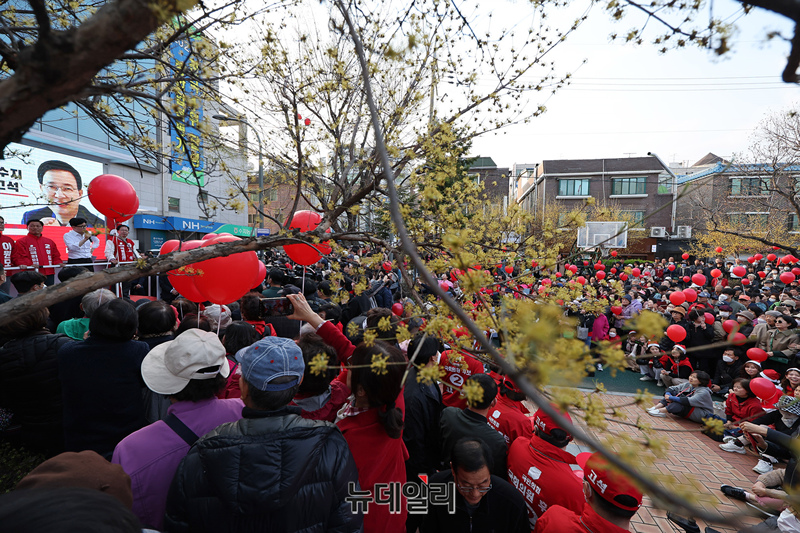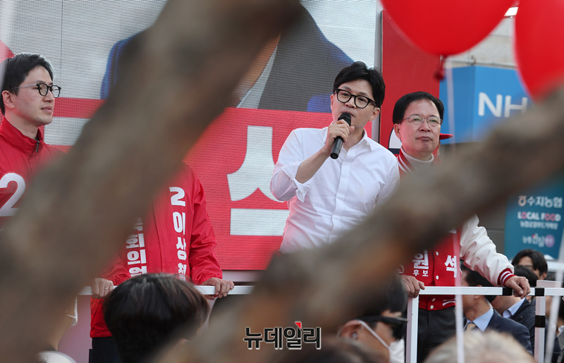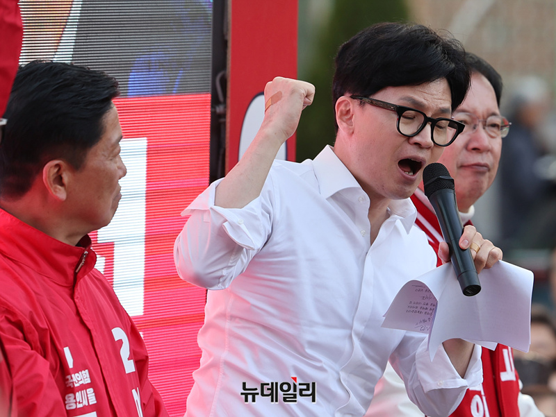 한동훈 국민의힘 총괄선대위원장이 4일 오후 경기 용인시 수지구청역 사거리 집중유세에서 이원모, 이상철, 고석 용인시 후보와 차량에 올라 지지호소를 하고 있다.