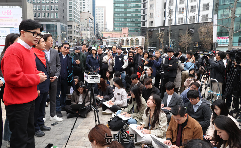 [포토] 기자들의 질문에 답하는 한동훈 선대위원장