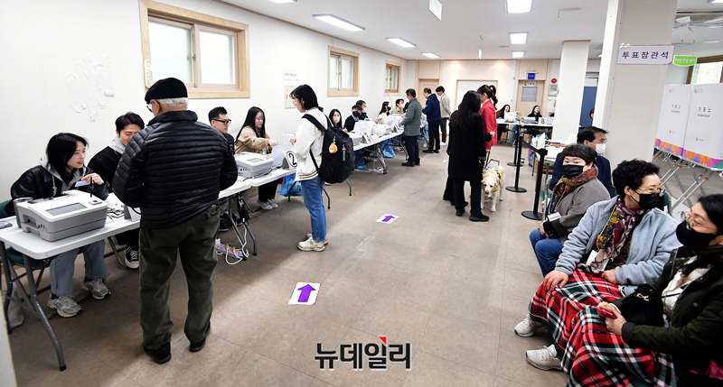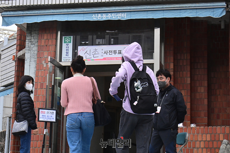 제22대 국회의원 선거 사전투표 첫날인 5일 오전 서울 서대문구 신촌동사전투표소를 찾은 시민들이 소중한 한표를 행사하고 있다.