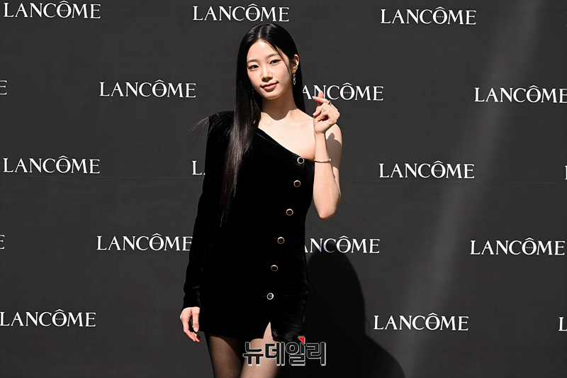 걸그룹 르세라핌 카즈하가 5일 오전 서울 성동구 카페 어우드 성수 1호점에서 열린 랑콤 'NEW 뗑 이돌 울트라 웨어 롱라스팅 파운데이션' 출시 기념 포토월에서 포즈를 취하고 있다.