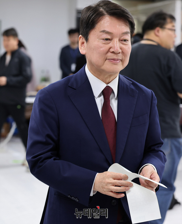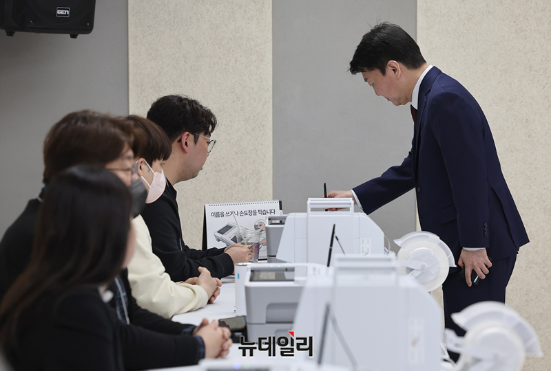 안철수 국민의힘 성남분당갑 후보가 5일 오후 경기 성남시 야탑2동 행정복지센터에서 사전투표를 하기 위해 투표지를 들고 기표소로 향하고 있다.
