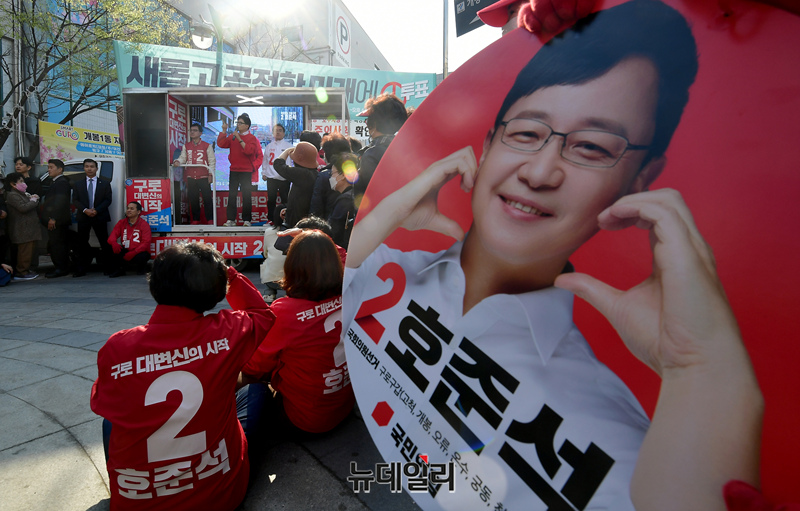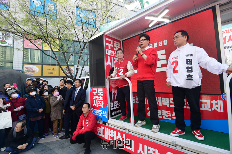 한동훈 국민의힘 비상대책위원장 겸 총괄선거대책위원장이 5일 서울 구로구 개봉역 앞에서 호준석 구로갑 후보, 태영호 구로을 후보, 지원유세를 하고 있다.