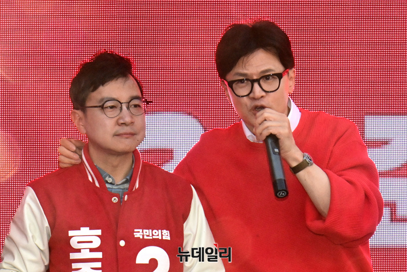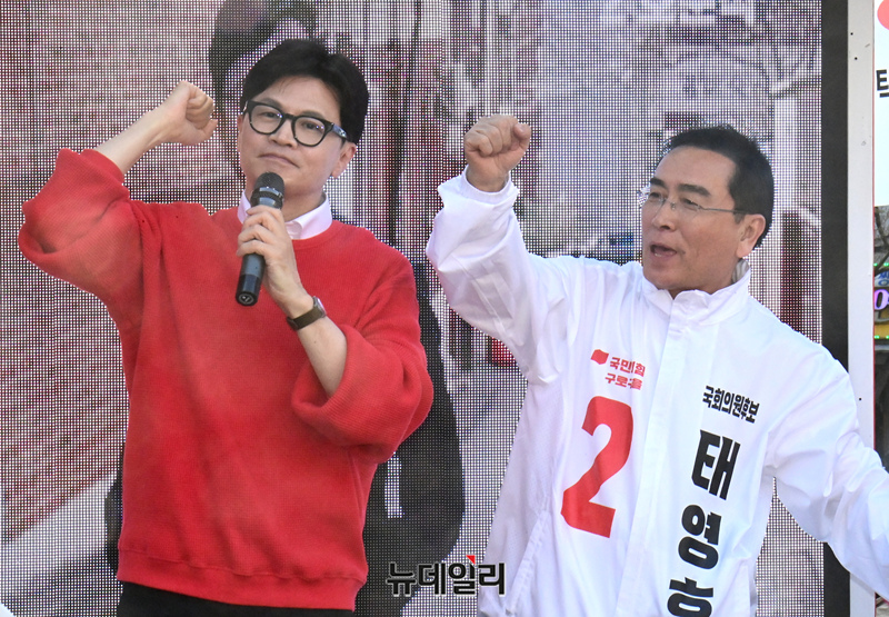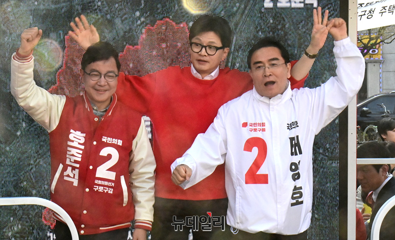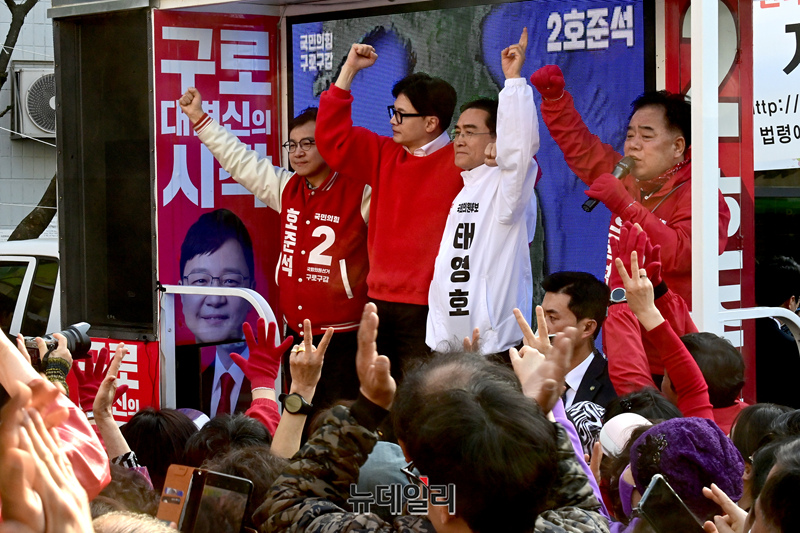 한동훈 국민의힘 비상대책위원장 겸 총괄 선거대책위원장이 5일 서울 구로구 개봉역 앞에서 호준석 구로갑 후보, 태영호 구로을 후보, 지원유세를 하고 있다.