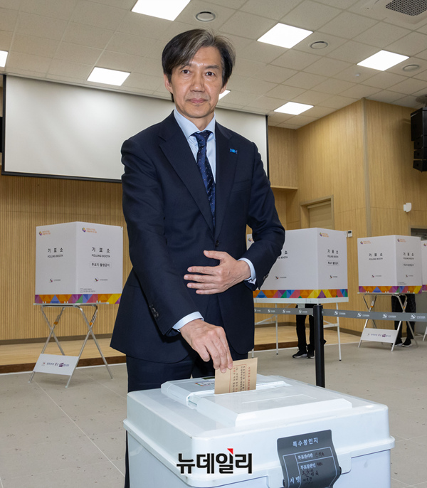 조국 조국혁신당 대표가 제22대 국회의원선거 사전투표일인 5일 오후 부산 강서구 명지1동 행정복지센터에서 사전투표를 하고 있다.
