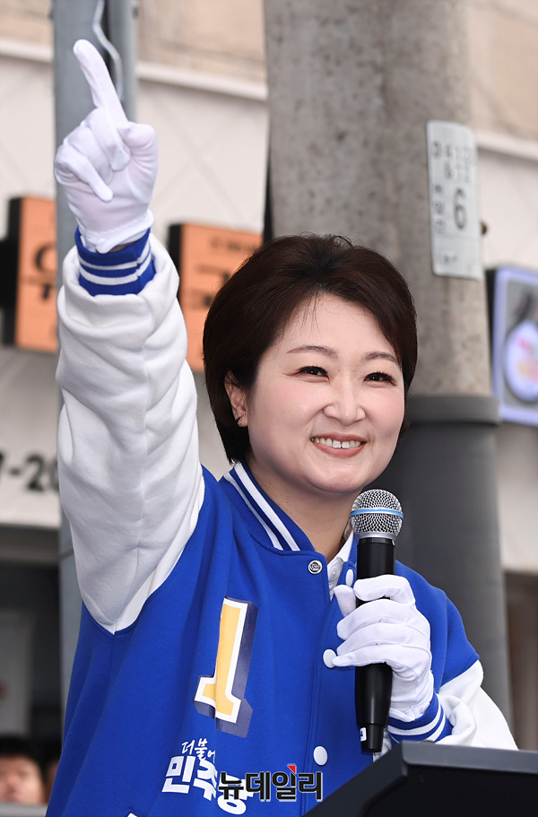 이언주 더불어민주당 용인정 후보가 6일 오전 경기 용인시 수지구청역 앞에서 열린 선거유세 현장에서 지지를 호소하고 있다. (경기 용인=서성진 기자)