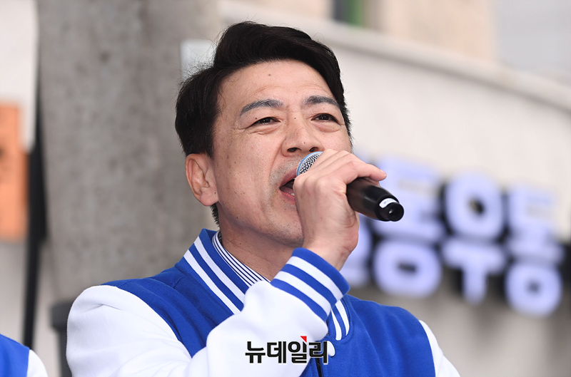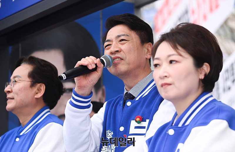 부승찬 더불어민주당 용인병 후보가 6일 오전 경기 용인시 수지구청역 앞에서 열린 선거유세 현장에서 지지를 호소하고 있다. (경기 용인=서성진 기자)