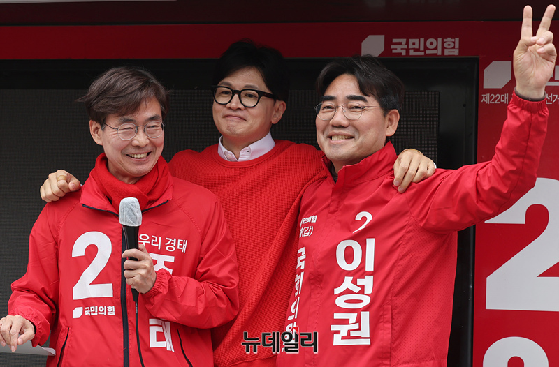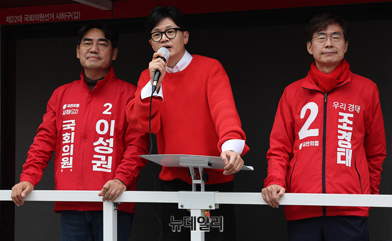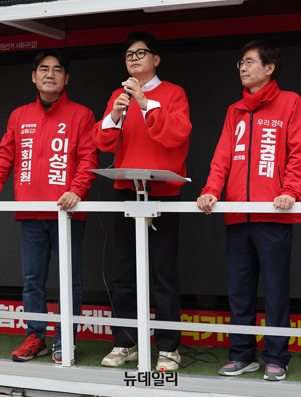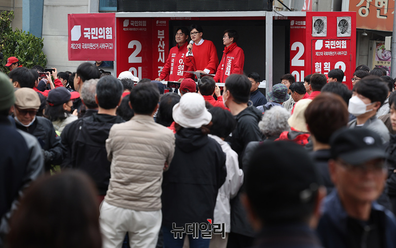 한동훈 국민의힘 총괄선대위원장이 사전투표 마지막 날인 6일 오후 부산 사하구 햇님공원에서 열린 지원유세에서 조경태(부산사하을), 이성권(부산사하갑) 후보와 차량에 올라 지지호소를 하고 있다. 한 위원장은 이날 영남권을 돌며 표심을 잡을 예정이다. (부산=정상윤 기자)
