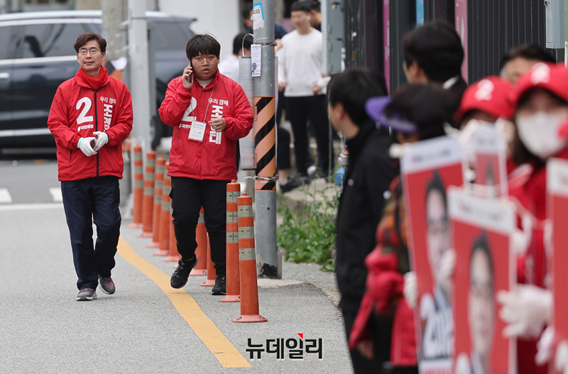 조경태 국민의힘 부산사하을 후보가 사전투표 마지막 날인 6일 오후 부산 사하구 햇님공원에서 열린 한동훈 지원유세장에 입장하고 있다. (부산=정상윤 기자)