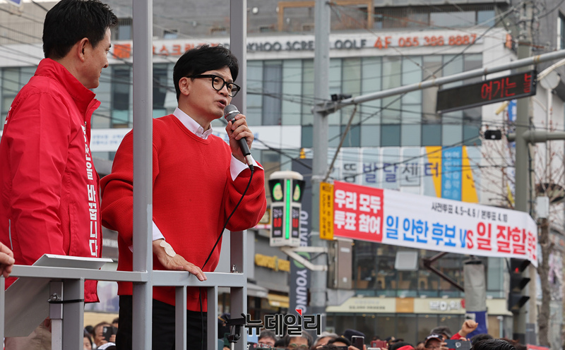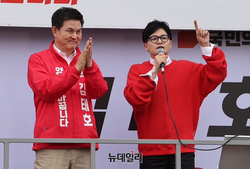 한동훈 국민의힘 총괄선대위원장이 사전선거 마지막 날인 6일 오후 경남 양산시 덕계사거리에서 열린 '국민의힘으로 양산살리기' 지원유세에서 김태호 양산을 후보 손을 잡고 지지호소를 하고 있다. 한 위원장은 이날 영남권을 돌며 표심을 잡고 있다. (경남 양산=정상윤 기자)