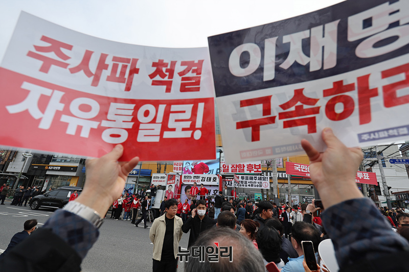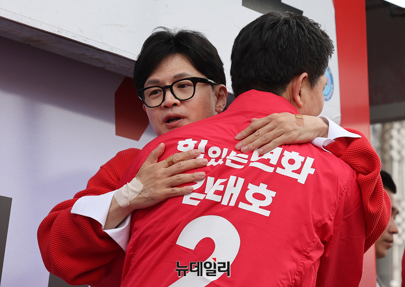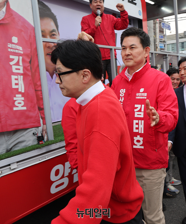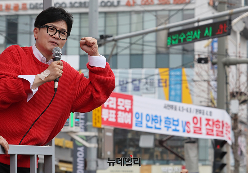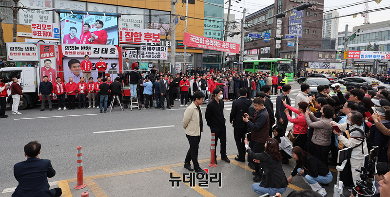 한동훈 국민의힘 총괄선대위원장이 사전선거 마지막 날인 6일 오후 경남 양산시 덕계사거리에서 열린 '국민의힘으로 양산살리기' 지원유세에서 김태호 양산을 후보 지원유세를 하고 있다. 한 위원장은 이날 영남권을 돌며 표심을 잡고 있다.