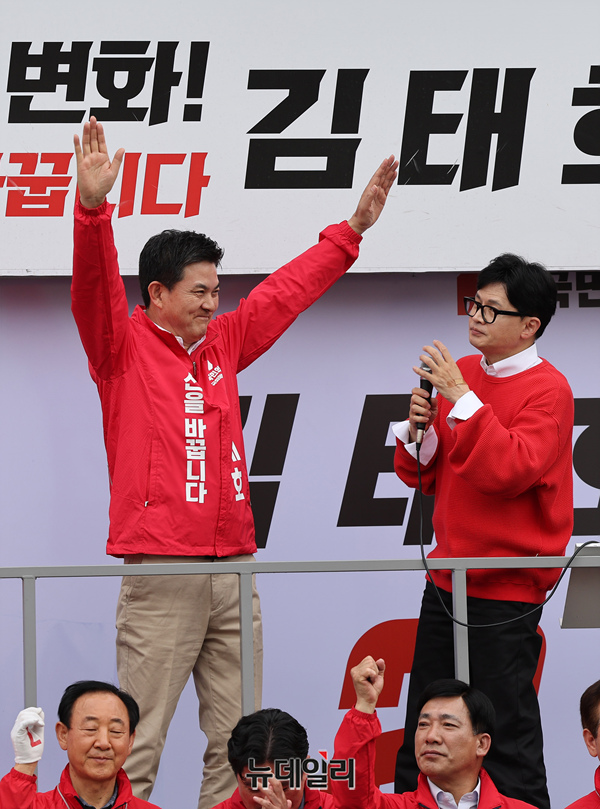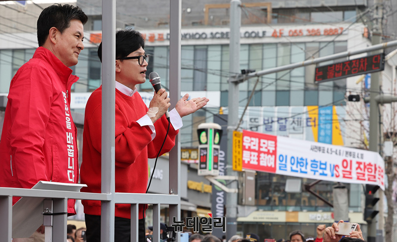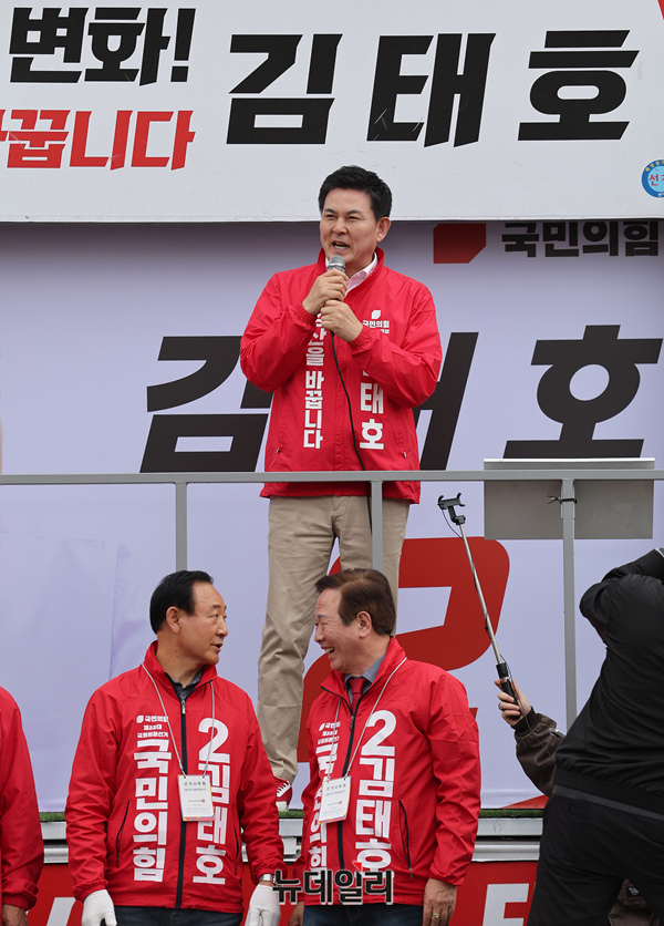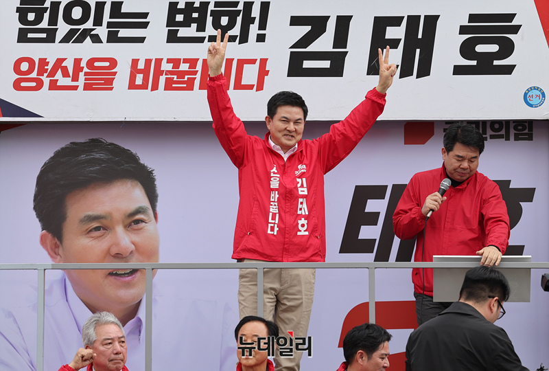 김태호 국민의힘 경남 양산을 후보가 사전선거 마지막 날인 6일 오후 경남 양산시 덕계사거리에서 열린 '국민의힘으로 양산살리기' 한동훈 총괄선대위원장 지원유세에서 지지호소를 하고 있다.