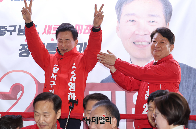 유영하 대구 달서갑 후보가 사전선거 마지막 날인 6일 오후 대구 동성로에서 열린 집중유세에서 한동훈 위원장의 발언을 눈을 감고 듣고 있다. 이날 한동훈 총괄선대위원장은 마지막 일정으로 대구를 보수층 집결을 강조했다.한 위원장은 이날 오전 경남 거제를 시작으로 부산, 울산, 경산 지역 등 영남권을 돌며 막판 표심잡기에 나섰다. 사전투표 마지막 날인 이날 오후 6시 집계된 사전투표율은 31.3%로 총선 역대 최초로 30%를 돌파했다. (대구=정상윤 기자)