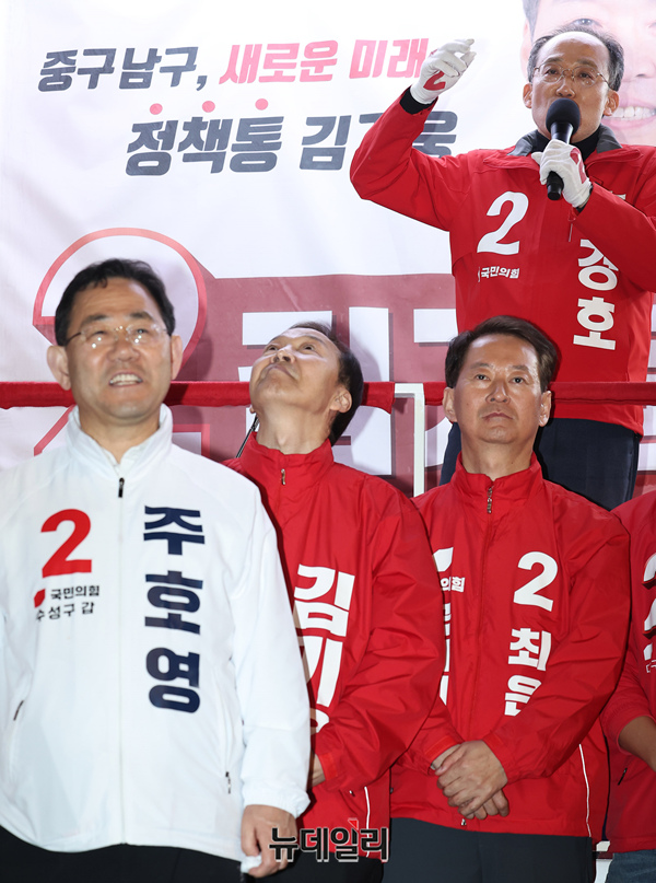 추경호 대구 달성 후보가 사전선거 마지막 날인 6일 오후 대구 동성로에서 열린 집중유세에서 차량에 올라 지지호소를 하고 있다. 이날 한동훈 총괄선대위원장은 마지막 일정으로 대구를 보수층 집결을 강조했다.