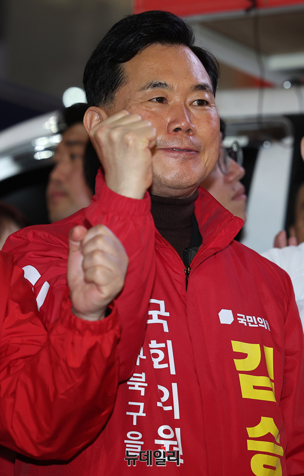 김승수 대구 북구을 후보가 사전선거 마지막 날인 6일 오후 대구 동성로에서 열린 집중유세에서 참석해 자리하고 있다. 이날 한동훈 총괄선대위원장은 마지막 일정으로 대구를 보수층 집결을 강조했다.
