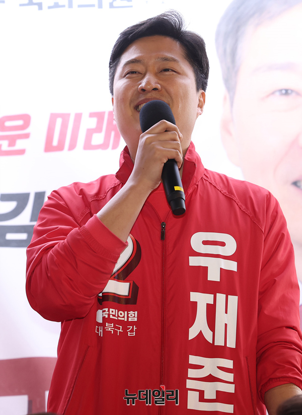 우재준 국민의힘 대구 북구갑 후보가 사전선거 마지막 날인 6일 오후 대구 동성로에서 열린 집중유세에서 차량에 올라 지지호소를 하고 있다. 이날 한동훈 총괄선대위원장은 마지막 일정으로 대구를 보수층 집결을 강조했다.한 위원장은 이날 오전 경남 거제를 시작으로 부산, 울산, 경산 지역 등 영남권을 돌며 막판 표심잡기에 나섰다. 사전투표 마지막 날인 이날 오후 6시 집계된 사전투표율은 31.3%로 총선 역대 최초로 30%를 돌파했다. (대구=정상윤 기자)