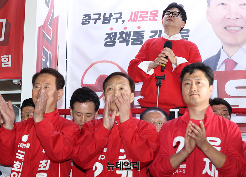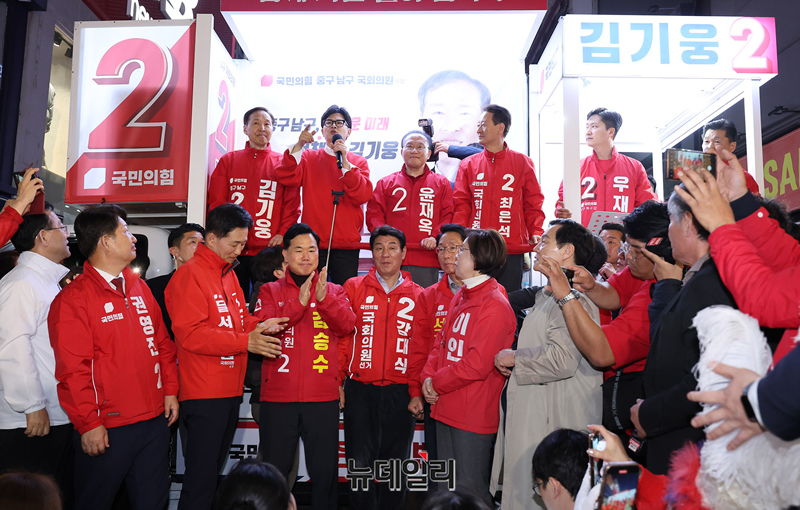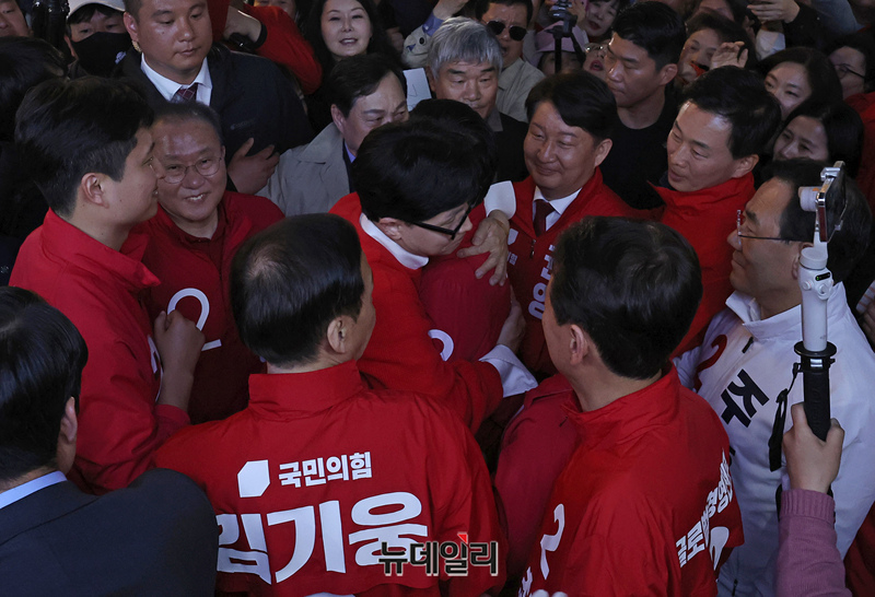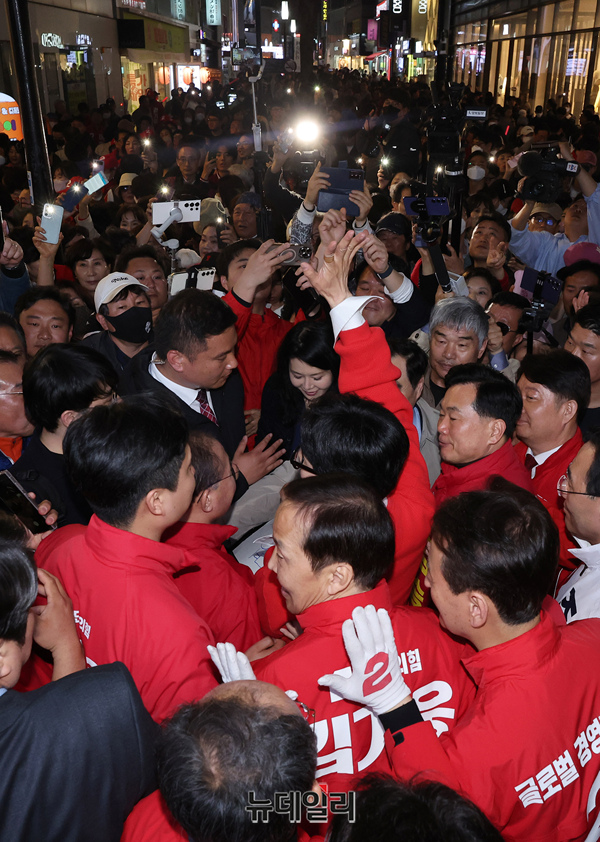 한동훈 국민의힘 총괄선대위원장이 사전선거 마지막 날인 6일 오후 우파의 심장지역인 대구 동성로를 찾아대구지역 후보들과 손을 잡고 결집을 호소하고 있다.한 위원장은 이날 오전 경남 거제를 시작으로 부산, 울산, 경산 지역 등 영남권을 돌며 막판 표심잡기에 나섰다. 사전투표 마지막 날인 이날 오후 6시 집계된 사전투표율은 31.3%로 총선 역대 최초로 30%를 돌파했다.선거 마지막 주말인 7일은 충청권을 돌며 표심잡기에 나설 예정이다. (대구=정상윤 기자)
