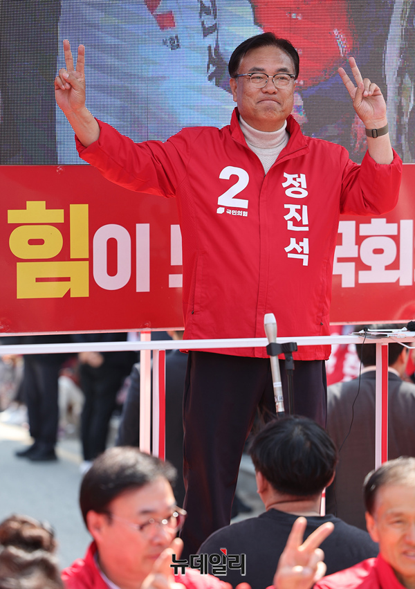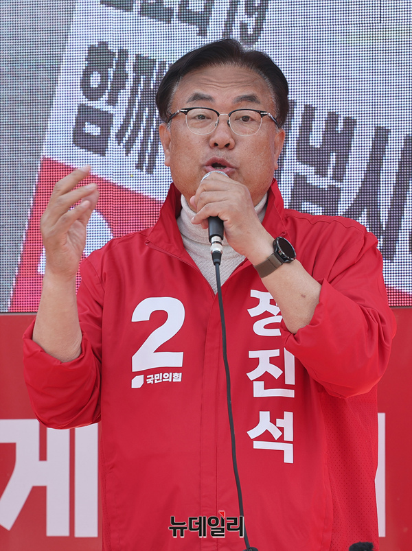 정진석 국민의힘 공주부여청양 후보가 선거 마지막 주말인 7일 오후 충남 공주대 대학로에서 열린 한동훈 지원유세에서 지지호소를 하고 있다.