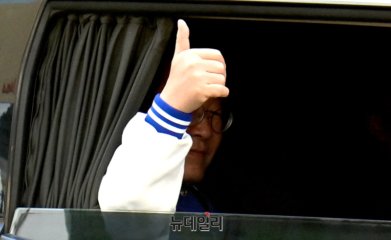 이재명 더불어민주당 상임선대위원장이 7일 오후 경기 하남 스타필드시티 위례에서 추미애 하남갑 후보와 김용만 하남을 후보 지지유세를 마치고 떠나고 있다. 이날 이 대표는 서울 '강남 3구'를 위주로 지원 유세를 펼쳤다. (경기 하남=이종현 기자)