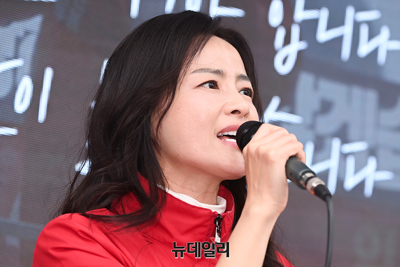 김효은 국민의힘 경기오산 후보가 8일 오후 경기 오산오색시장 앞에서 열린 선거유세 현장에서 지지를 호소하고 있다. (경기 오산=서성진 기자)