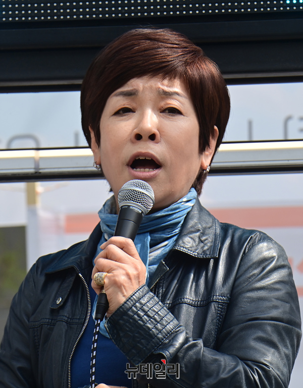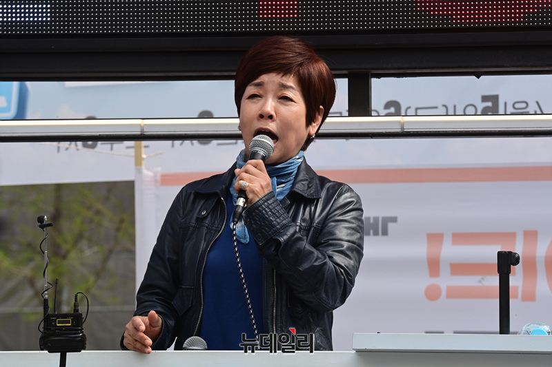 방송인 김미화가 8일 오후 서울 종로구 동묘앞역에서 열린 곽상언 더불어민주당 종로 후보 집중유세에서 지지를 호소하고 있다.