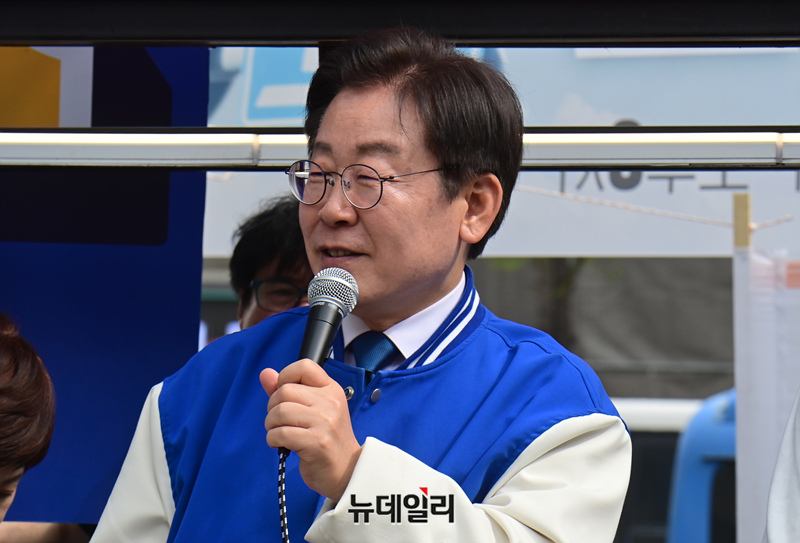 이재명 더불어민주당 상임공동선대위원장이 8일 오후 서울 종로 동묘앞에서 곽상언 종로 후보의 지지를 호소 하고 있다.