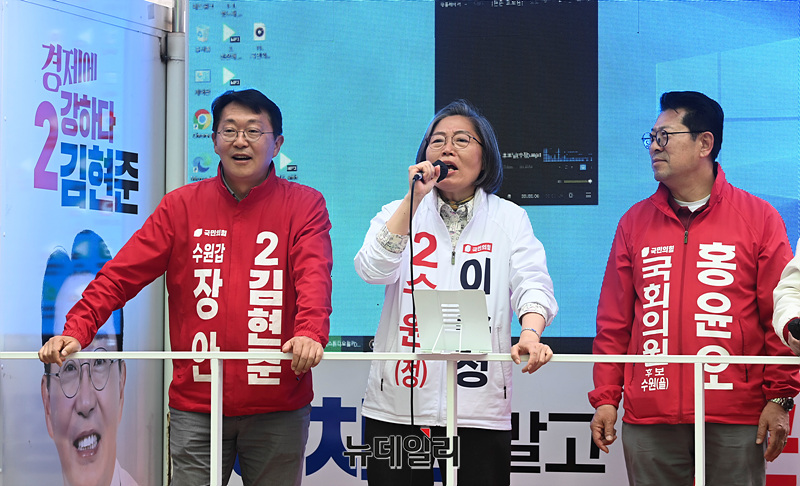 이수정 국민의힘 수원정 후보가 8일 오후 경기 수원시 북수원시장에서 열린 선거유세 현장에서 김현준 수원갑 후보, 홍윤오 수원을 후보와 함께 지지를 호소하고 있다. (경기 수원=서성진 기자)