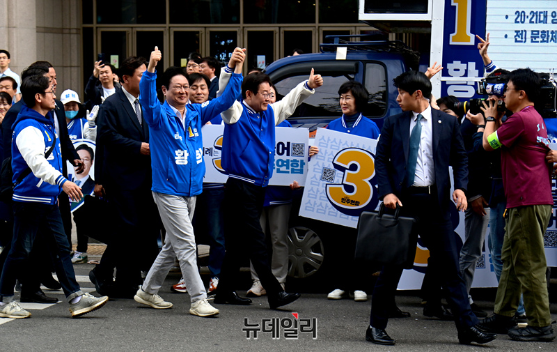 이재명 더불어민주당 상임공동선대위원장이 8일 오후 서울 양천구 현대백화점 목동점 앞에서 황희 양천구갑 후보의 손을잡고 집중유세장으로 입장하고 있다.
