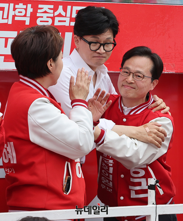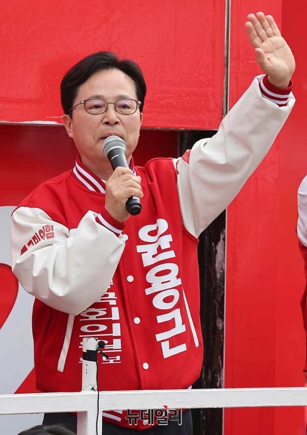 윤용근 국민의힘 성남중원 후보가 4.10 국회의원선거 2일을 남겨둔 8일 오후 경기 성남시 야탑광장에서 열린 집중유세에서 지지호소를 하고 있다. 이날 유세장을 찾은 한동훈 총괄선대위원장은 수도권 일대를 돌며 막바지 표심잡기에 나서고 있다. (경기 성남=정상윤 기자)