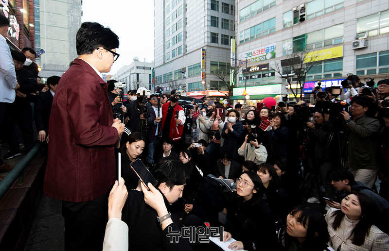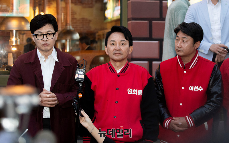 한동훈 국민의힘 총괄선대위원장이 본투표 이틀을 남기고 8일 오후 인천 계양구 소재 '한우 전문점'에서 원희룡 계양을 후보, 이천수 후원회장과 식사를 마치고 나와 취재진의 질문에 답하고 있다.