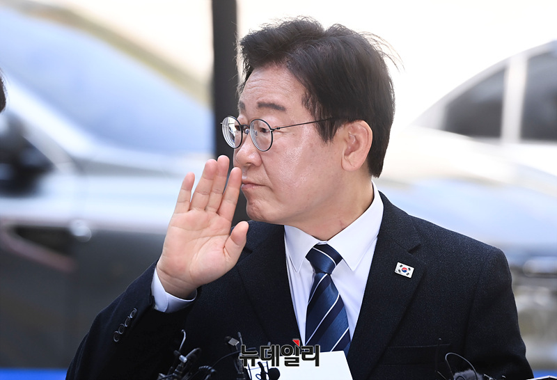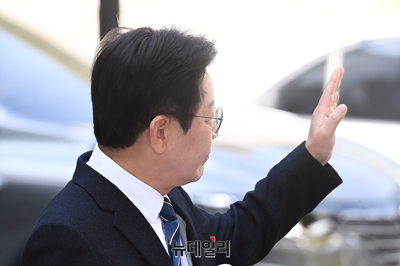 이재명 더불어민주당 대표가 4.10 총선을 하루 앞둔 9일 오전 서울 서초구 중앙지법에서 열린 '대장동 배임 및 성남FC 뇌물 의혹 사건' 1심 공판에 출석하며 지지자들에게 인사하고 있다.