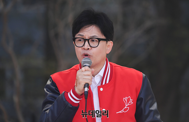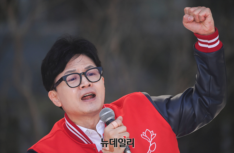 한동훈 국민의힘 총괄선대위원장이 9일 오전 서울 성동구 왕십리역 앞에서 열린 윤희숙 중·성동갑 후보 선거유세 현장에서 지지를 호소하고 있다.