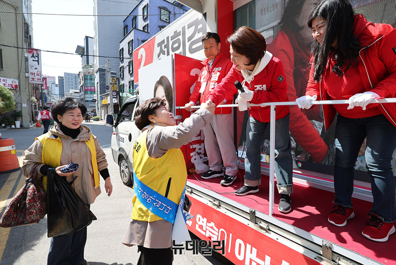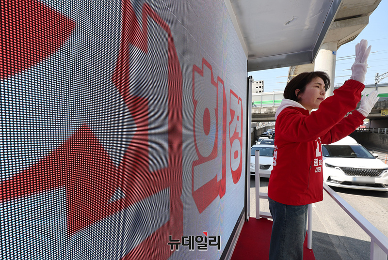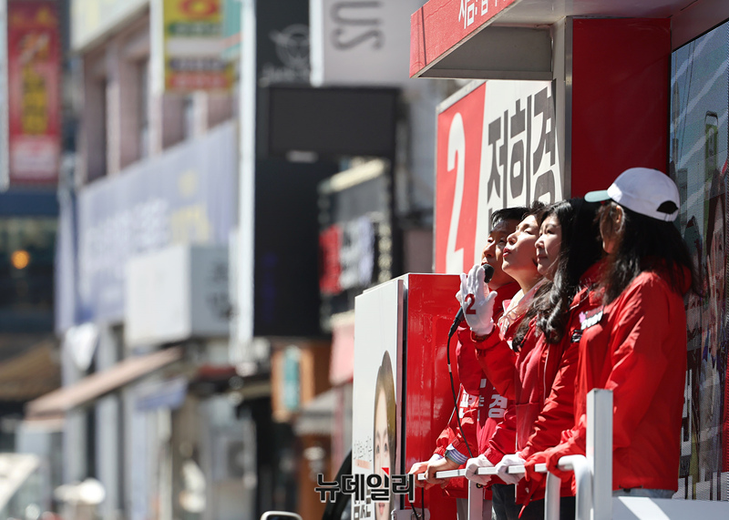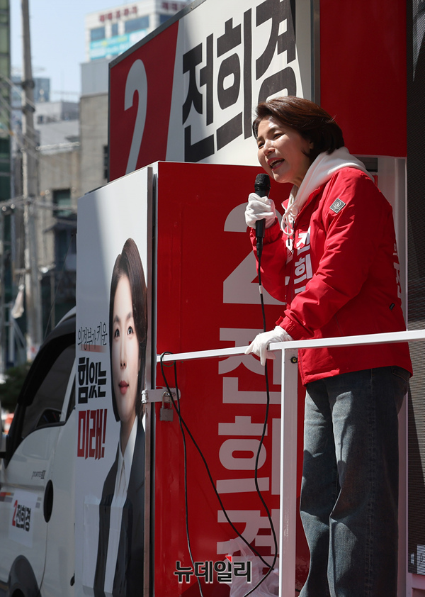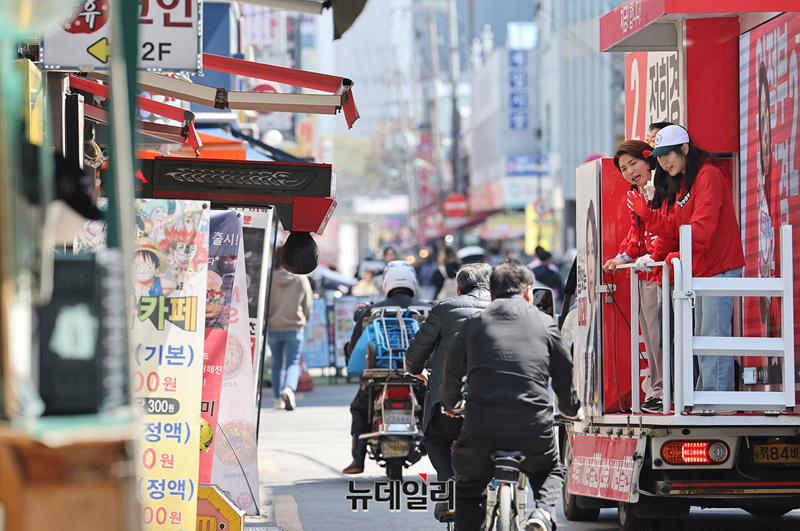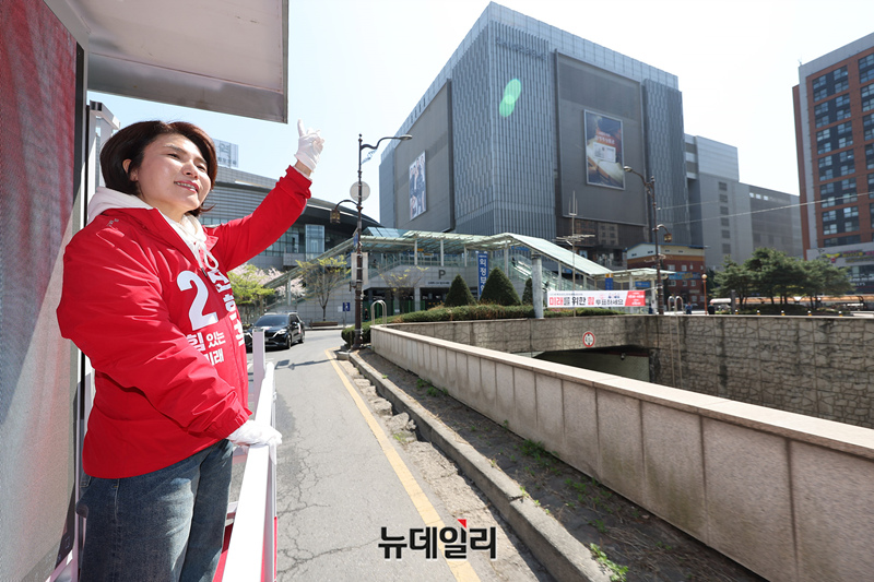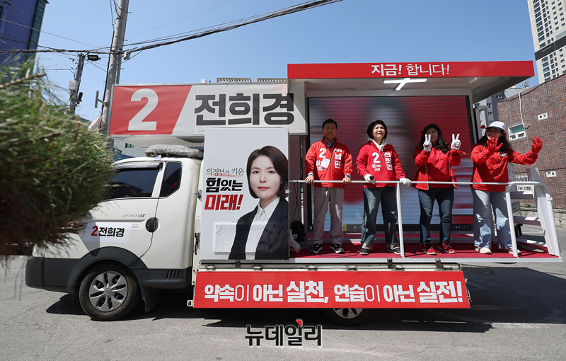 4.10 국회의원 선거를 하루 앞둔 9일 오전 전희경 국민의힘 경기 의정부갑 후보가 유세차량에 올라 의정부역 인근지역에서 시민들에게 인사를 하고 있다.이날 한동훈 국민의힘 총괄선대위원장과 이재명 더불어민주당 상임공동선대위원장은 청계광장과 용산역에서 파이널 유세로 선거운동을 마무리 할 예정이다.투표일인 10일은 법정공휴일로 오전 6시부터 오후 6시까지 지정된 내 투표소에서 투표 가능하다. 관공서나 공공기관이 발행한 증명서로 생년월일이 기재되고 사진이 첩부돼 본임임을 확인할수 있는 주민등록증이나 여권 등이 필요하다. (경기 의정부=정상윤 기자)