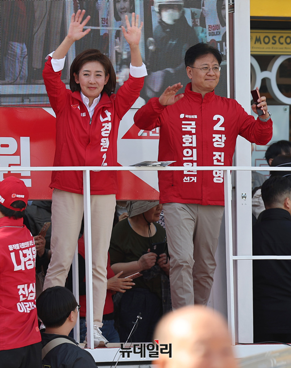 나경원 국민의힘 동작을 후보가 선거를 하루 앞둔 9일 오후 서울 동작구 중앙대병원 앞에서 열린 한동훈 총괄선대위원장 지원유세에서 장진영 동작갑 후보와 함께 차량에 올라 지지호소를 하고 있다.