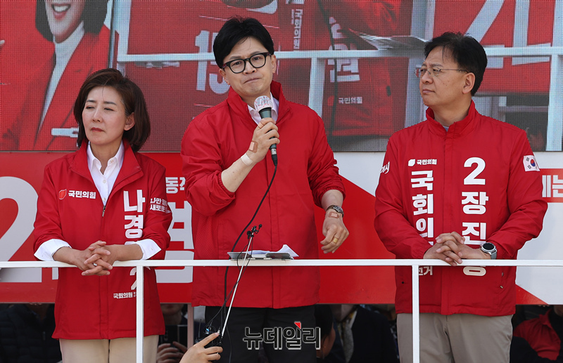 한동훈 국민의힘 총괄선대위원장이 선거를 하루 앞둔 9일 오후 서울 동작구 중앙대병원 앞에서 열린 지원유세에서 나경원, 장진영 후보와 차량에 올라 지지호소를 하고 있다. 한 위원장은 이날 저녁 청계광장에서 마지막 피날레 유세를 이어갈 예정이다.투표일인 10일은 법정공휴일로 오전 6시부터 오후 6시까지 지정된 내 투표소에서 투표 가능하다. 관공서나 공공기관이 발행한 증명서로 생년월일이 기재되고 사진이 첩부돼 본임임을 확인할수 있는 주민등록증이나 여권 등이 필요하다.