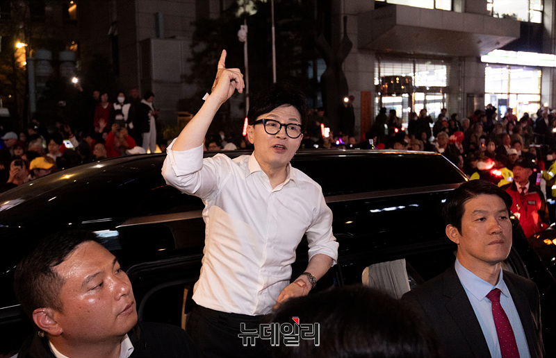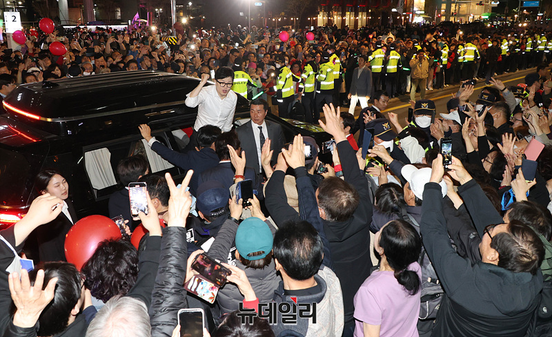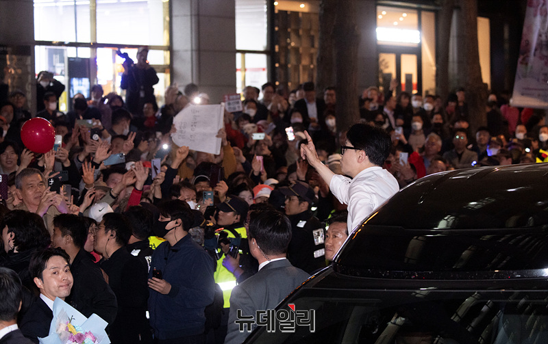 한동훈 국민의힘 총괄선대위원장이 9일 오후 서울 중구 청계광장에서 열린 '국민의힘으로 대한민국 살리기' 제22대 총선 파이널 총력유세를 마치고 떠나며 인사를 하고 있다.